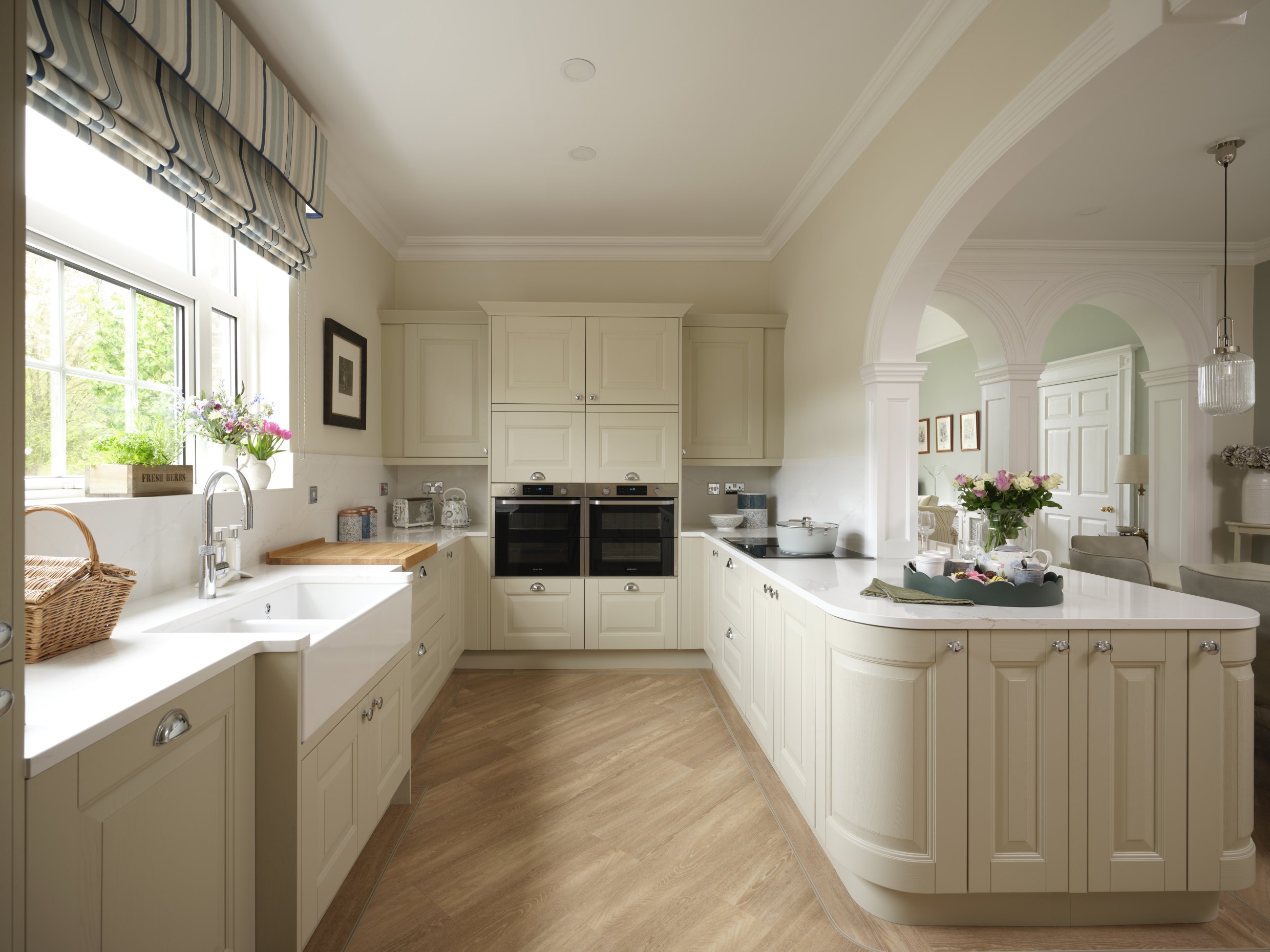 This beautiful design is enhanced with a Belfast sink, low-level ovens and a peninsula, along with neutral colour tones and delicate handles for a classic look.