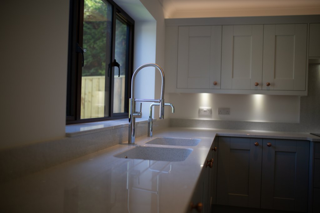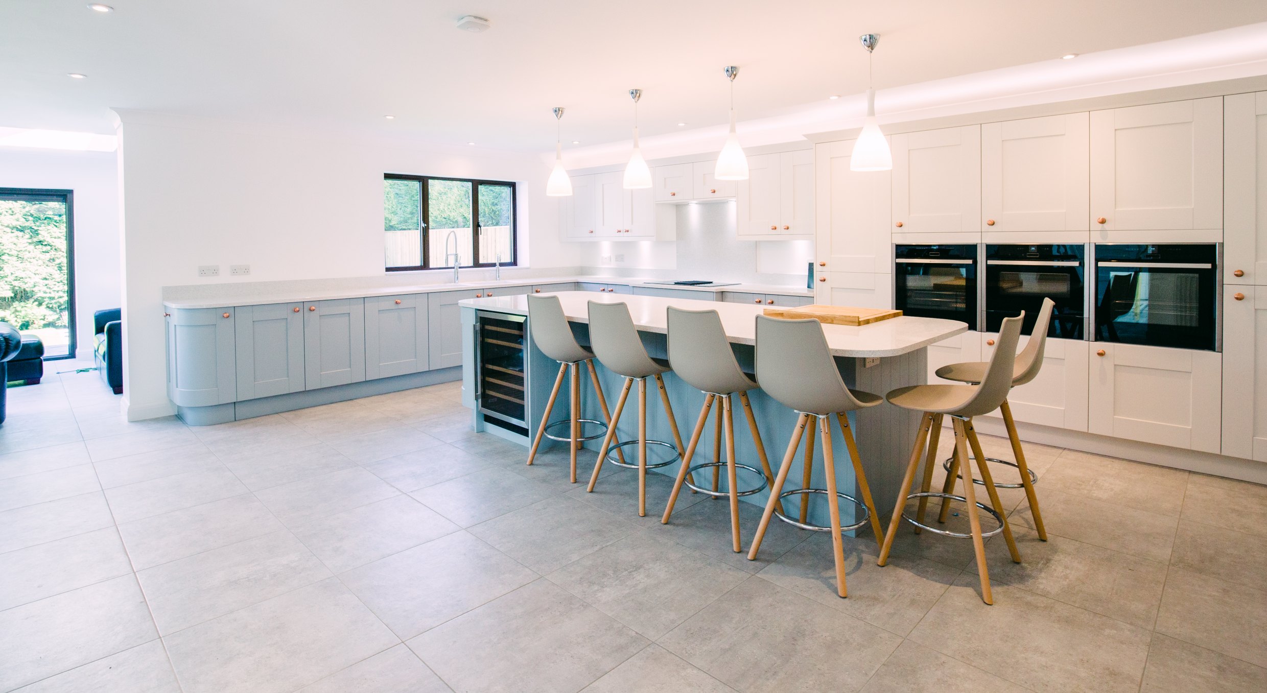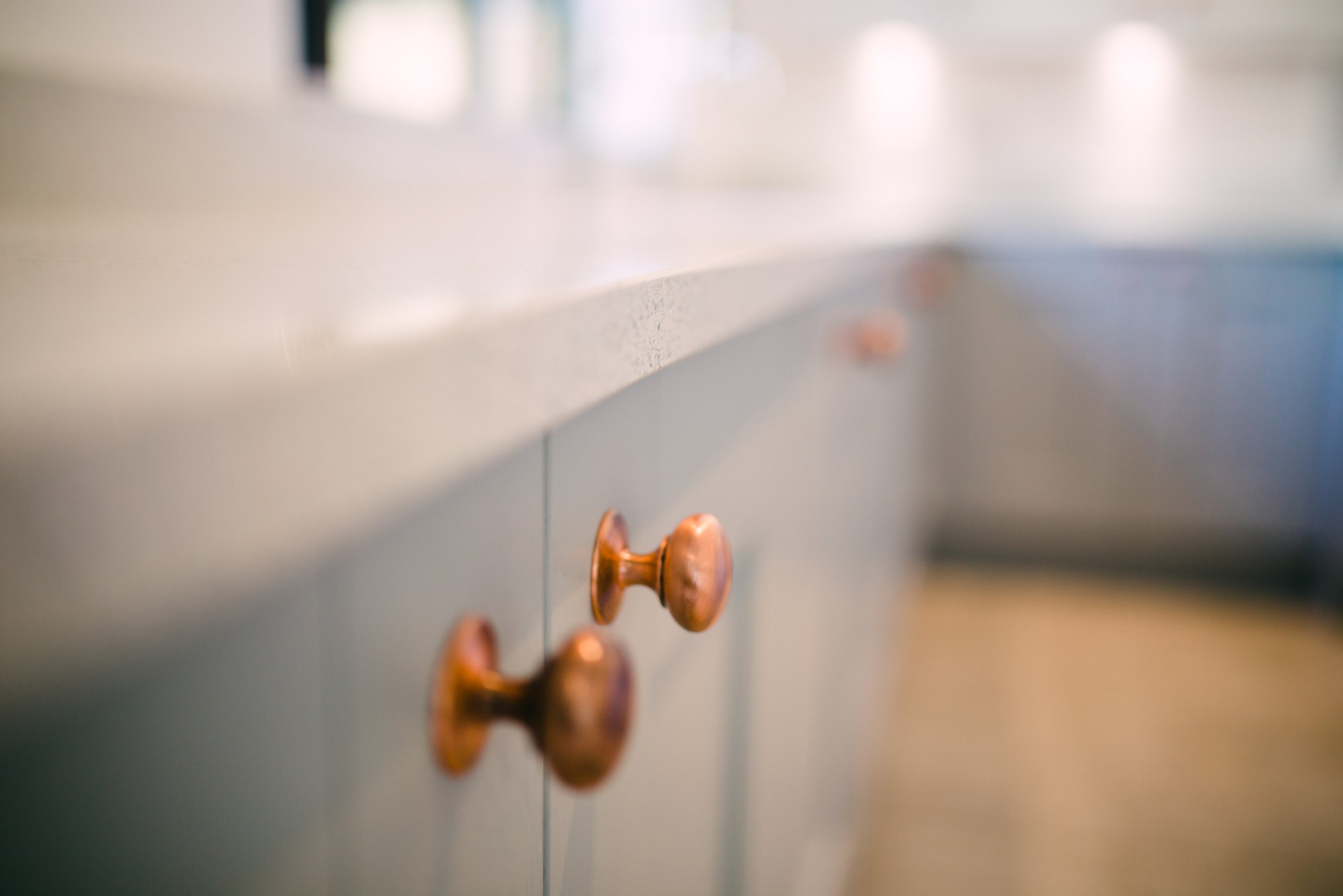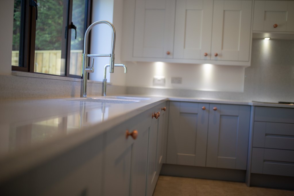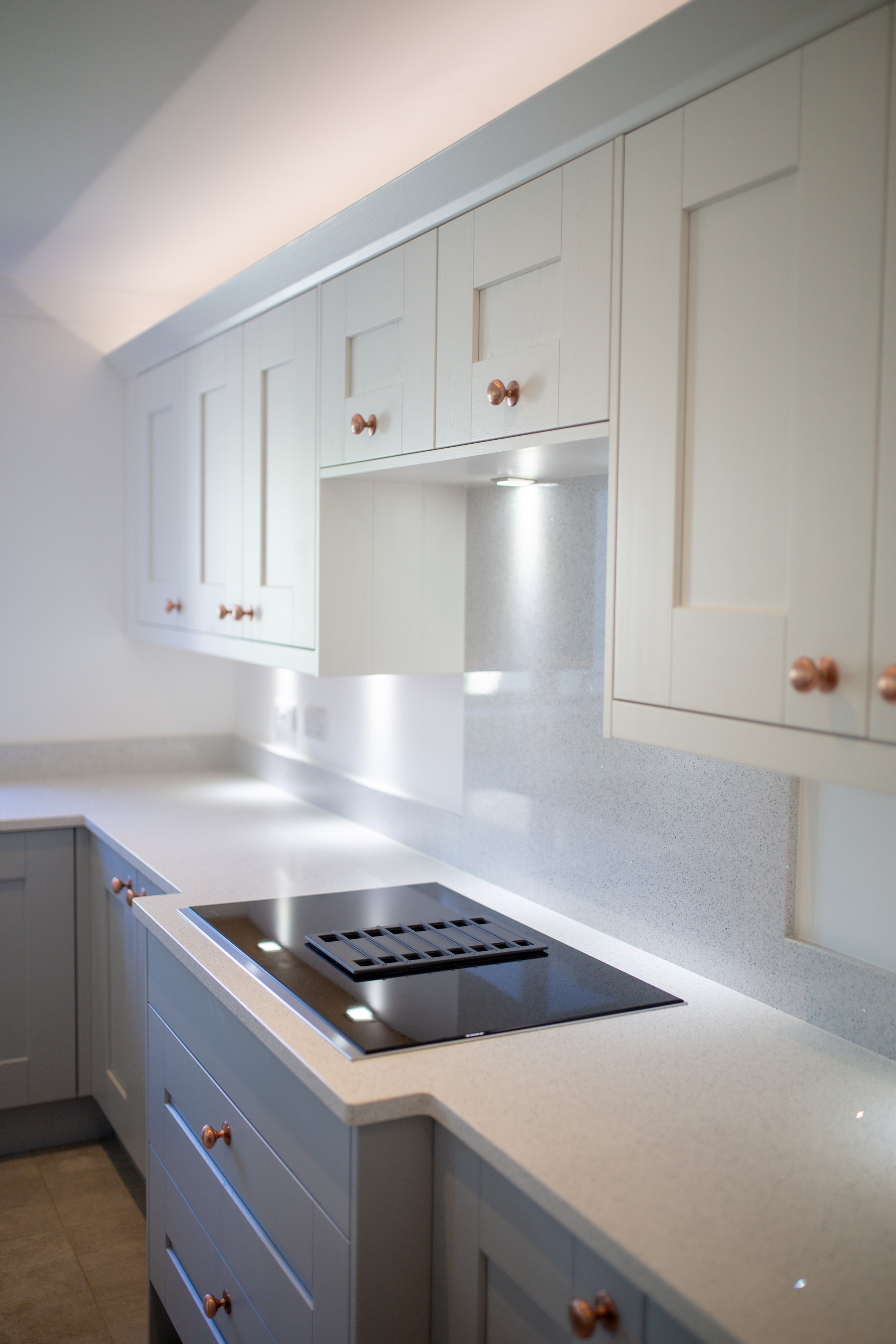 The homeowners have kept things simple with by pairing the light worktops with the French Grey and Chalk White of Whitby. The copper handles really complement the design style and add an ontrend colour into the mix.